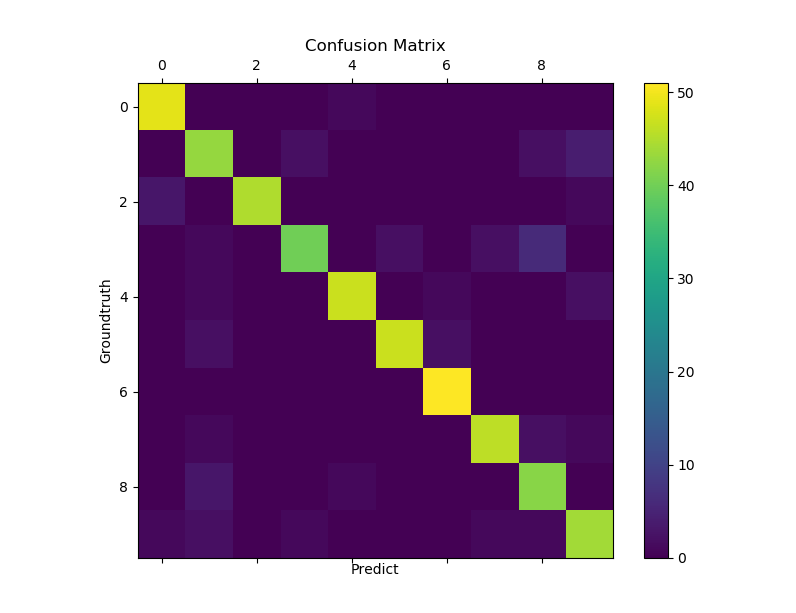 使用的数据是sklearn中的digital数据其每一个样本由64个像素组成输出结果是0-9中的一个数。由于输入和输出都是一个高维向量最后结果采用confusion matrix可视化出来其主对角线上的个数为预测正确的数目其余位置上的元素为预测失败的样本个数。
